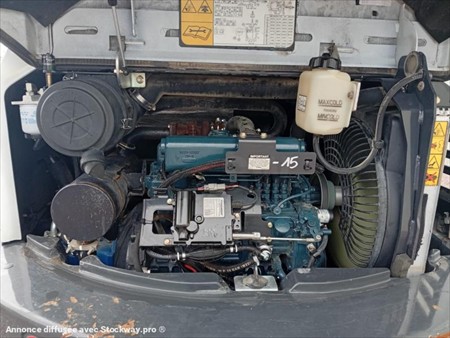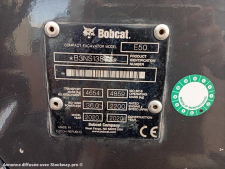 Bobcat E50 Numéro de stock : 7754 Marque : Bobcat Modèle : E50 Année : 2020 Heures : 2740h Numéro de série : B3NS13851 Poids : 5000kg Hauteur : 2m53 Largeur : 1m96 Longueur : 5m55 Chenilles : Caoutchouc Usure chenille droite : 30% Usure chenille gauche : 30% Godets : 50cm Nombre de godets : 1 2 Vitesses : Oui Moteur : Kubota 4 cylindres Accessoires : - 2 ligne auxiliaire - Attache rapide hydraulique Tarif vendu dans l’état : 29 500€ H.T (TVA à 20% récupérable pour les professionnels) Possibilité de matériel vendu révisé, vidangé et garantie pour un supplément de 2 500€ HT. Nous sommes une entreprise multimarques spécialisée dans le négoce de matériels TP et Agricoles dans les Deux-Sèvres. Une large gamme de produits est disponible sur notre parc : Mini pelle, chariot télescopique, dumper, remorques et autres matériels divers. Nous pouvons assurer des livraisons dans toute la France.