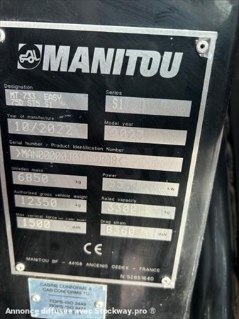 Manitou MT733 Numéro de stock : 7788 Marque : Manitou Modèle : MT733 Année : 2022 Heures : 739h Numéro de série : 1089808 Poids : 6850kg Capacité de levage : 3T3 Hauteur : 2m30 Largeur : 2m33 Longueur : 4m74 Hauteur de levage : 7m Pneus avant : 400/80-25 Pneus arrière : 400/80-25 Usure pneus avant : 30% Usure pneus arrière : 30% Roues motrices : 4RM Moteur : Deutz 4 cylindres 75CV Accessoires : - Ligne auxiliaire - Monolevier - Fourche à palette Tarif vendu dans l’état : 54 000€ H.T (TVA à 20% récupérable pour les professionnels) Possibilité de matériel vendu révisé, vidangé et garantie pour un supplément de 3000€ HT. Nous sommes une entreprise multimarques spécialisée dans le négoce de matériels TP et Agricoles dans les Deux-Sèvres. Une large gamme de produits est disponible sur notre parc : Mini pelle, chariot télescopique, dumper, remorques et autres matériels divers. Nous pouvons assurer des livraisons dans toute la France