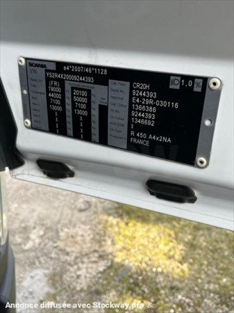 TRACTEUR SCANIA R 450 HIGH LINE EURO6 BOITE AUTOMATIQUE RETARDER CLIMATISATION CHAUFFAGE DEFLECTEUR 2 RSERVOIRS : 500L // 400L BLOCAGE DIFFERENTIEL ORDINATEUR DE BORD 1COUCHETTES GPS FRIGO SUSPENSIONS LAMES AVANT ET SUSPENSIONS AIR ARRIERE IMMAT : FA 797 WQ AN : 04/10/2018 KMS : 594659 CHASSIS : YS2R4X20009244393 MINES : 02/04/2026 DOSSIER : 5972 PHOTOS : VEHICULE VISIBLE A SAVIM 165 CHEMIN DU GUIGONNET 13270 FOS SUR MER TARIF HT : SUR DEMANDE