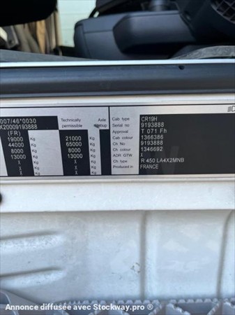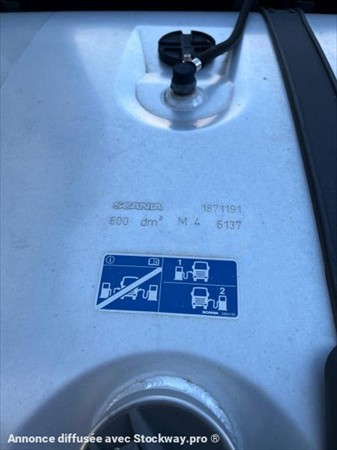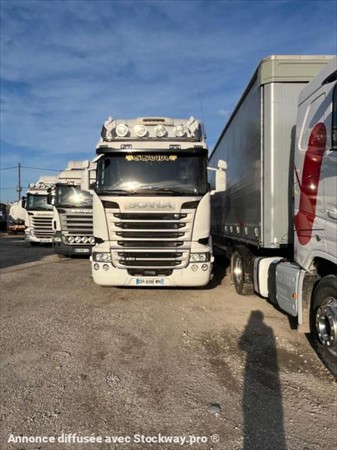 TRACTEUR SCANIA R 450 HIGH LINE EURO6 BOITE AUTOMATIQUE RETARDER CLIMATISATION CHAUFFAGE DEFLECTEUR JANTES ALU BICOOL 2 RSERVOIRS : 500L // 600 BLOCAGE DIFFERENTIEL ORDINATEUR DE BORD 1 COUCHETTES GPS FRIGO SUSPENSIONS AIR AVANT ET SUSPENSIONS AIR ARRIERE IMMAT : DR 698 WN AN : 28/05/2015 KMS : 553000 CHASSIS : YS2R4X20009193888 MINES : 05/06/2026 DOSSIER : 5973 PHOTOS : VEHICULE VISIBLE A SAVIM 165 CHEMIN DU GUIGONNET 13270 FOS SUR MER TARIF HT : SUR DEMANDE