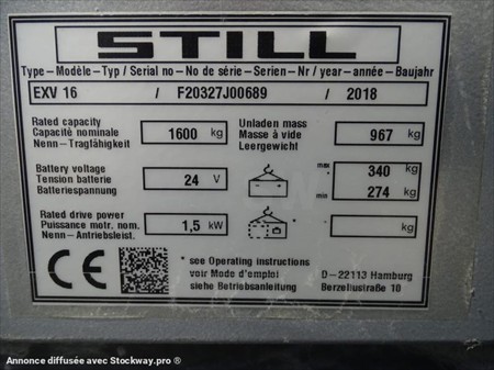 Umweltplakette Fahrzeugdaten Fabrikat: Still Typ: EXV16 Antriebsart: Elektro Tragkraft: 1600kg Hubhöhe: 1844 mm Baujahr: 2018 Betriebsstunden: 2752 Interne Nr.: 7536949 Mastdaten Masttyp: Standard Hubhöhe: 1844 mm Bauhöhe: 1490 mm Gabeln: 1150 x 0 x 0 mm Abmessungen Bauhöhe: 1490 mm Eigengewicht: 967 kg Batterie & Ladegerät Batterie Volt: 24 V Beschreibung & Sonderausstattung Anbaugeräte: Sonderausstattung: Gabelaußenbreite 566mm, Tandemrollen;, Bereifung Vorne: x / Vulkollan / Bereifung Hinten: x / Vulkollan /