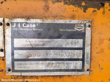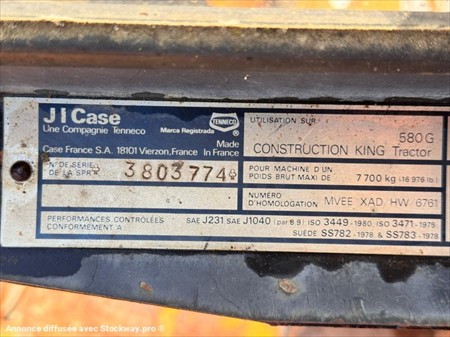 TRACTOPELLE CASE 580G 4x4 N° de série 3932973 Année 1983 - 6475 heures Poids 7700Kg 1 Godet drop avant + 1 godet rétro Moteur David Brown 219 4 cylindres 3590cm³ 49kW / 67cv Dim : L 5,7m x l2,4m x H 3,4m Moteur démarre et hydraulique fonctionnelle. Machine à rafraichir. Lors de sa réception, un employé qualifié de DB EQUIPMENT a effectué un contrôle des éléments essentiels du matériel, et a pu constater : moteur démarre avec booster, commandes hydrauliques fonctionnelles, quelques fuites hydrauliques non identifiées. Ce matériel est disponible sur parc, et peut être essayé sur nos horaires d'ouverture sur simple rendez-vous. REPRISE ET LIVRAISON POSSIBLE Nous nous efforçons de publier des informations les plus précises possibles mais aucun droit ne peut être tiré des textes publiés.