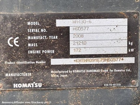 Chargeuse sur pneus 21T Komatsu WA430-6 N° de série KMTWA091E79H60577 Année 2008 - 8370 heures évolutives Poids 21210Kg Transmission Powershift à convertisseur de couple 4 vit av + 4 vit arr 4 roues motrices Climatisation Hauteur de déversement 2,90m Voie 2280mm / Empattement 3300mm Godet chargeur 3,5m³ Largeur de godet : 3m Dimensions : L 8,70m x l 3,0m x H 3,40m Moteur Komatsu SAA6D11AE 6 cylindres 8270 cm³ stage IIIA 172kW / 235cv Pneus 23.5R25 Lors de sa réception, un employé qualifié de DB EQUIPMENT a effectué un contrôle des éléments essentiels du matériel, et a pu constater : son bon fonctionnement général, bon démarrage, motorisation ok, système hydraulique ok sans fuite apparente. Ce matériel est disponible sur parc, et visible sur nos horaires d'ouverture sur simple rendez-vous. REPRISE ET LIVRAISON POSSIBLE Nous nous efforçons de publier des informations les plus précises possibles mais aucun droit ne peut être tiré des textes publiés.