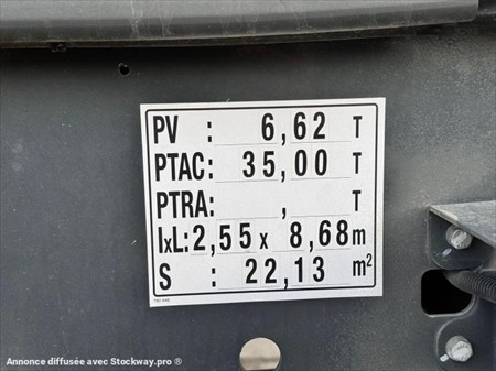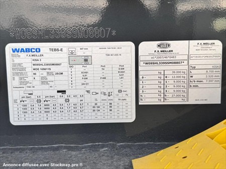 Semi-remorque benne acier Meiller KISA 3 Immatriculation HG-677-RH du 18/11/2025 6170 kms au 12/01/2025 évolutifs N° de série W09SHL339SSM08807 Modèle MHPS 44.3-N Capacité 28m³ / PTRA 38T Poids à vide 6620Kg Fond de 8mm / Coté de 6mm Bâchage électrique Meiller avec capot de protection BAE et porte arrière hydraulique Suspensions pneumatiques 1er essieu relevable Trappe charbonnière centrale 1 coupleur hydraulique vissé Ecran de contrôle Wabco smartBoard Dimensions : L 8,70m x l 2,52m Longueur de benne 7,60m Hauteur coté 1,5m Pneus 385/65R22.5 Lors de sa réception, un employé qualifié de DB EQUIPMENT a effectué un contrôle des éléments essentiels du matériel, et a pu constater : son bon fonctionnement général. Ce matériel est disponible sur parc, et visible sur nos horaires d'ouverture sur simple rendez-vous. REPRISE ET LIVRAISON POSSIBLE Nous nous efforçons de publier des informations les plus précises possibles mais aucun droit ne peut être tiré des textes publiés.