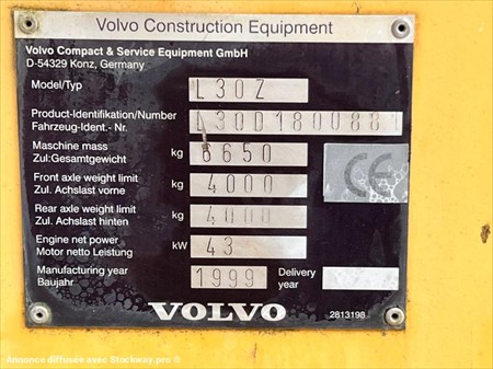 CHARGEUSE A PNEUS 6,5T VOLVO L30Z Année 1999 - 6811 heures évolutives N° de série L30D1800881 Poids 6650 Kg Accessoires : Godet drop + Fourches Hauteur de levage 4,0m Hauteur de déversement 2,45m Capacité 2,5T Dimensions : L 4,5m x l 2,0m x H 2,70m Pneus 12,5R20 Moteur Deutz BF4L 1011FT 43kW / 58cv Lors de sa réception, un employé qualifié de DB EQUIPMENT a effectué un contrôle des éléments essentiels du matériel, et a pu constater : son bon fonctionnement général, aucune fuite apparente, usure pneus 40%. Ce matériel est disponible sur parc, et peut être essayé sur nos horaires d'ouverture sur simple rendez-vous. REPRISE ET LIVRAISON POSSIBLE. Nous nous efforçons de publier des informations les plus précises possibles mais aucun droit ne peut être tiré des textes publiés.