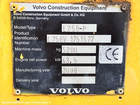 CHARGEUSE SUR PNEUS 5T VOLVO L25B-P Année 2006 - 5095 heures évolutives N° de série L25BV1751577 Poids 5200 Kg Accessoires : Godet drop + Fourches Hauteur de levage 4,0m Hauteur de déversement 2,40m Capacité 3,7T (2,7T avec fourches) Dimensions : L 5,1m x l 1,80m x H 2,50m Pneus 12,5R18 Moteur VOLVO D3DCBE1 3620cm³ 43,5kW / 58cv Lors de sa réception, un employé qualifié de DB EQUIPMENT a effectué un contrôle des éléments essentiels du matériel, et a pu constater : son bon état général, aucune fuite apparente, usure pneus 80%. Ce matériel est disponible sur parc, et peut être essayé sur nos horaires d'ouverture sur simple rendez-vous. REPRISE ET LIVRAISON POSSIBLE. Nous nous efforçons de publier des informations les plus précises possibles mais aucun droit ne peut être tiré des textes publiés.