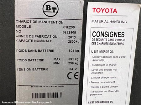 Gerbeur transpalette électrique Toyota BT 0SE250 n° de série 6252508 Année 2013 - 658 heures évolutives Capacité 2500Kg Hauteur de levée 240mm Fourches 120cm Batterie 24V / 465Ah Batterie changée en 2022 Poids 1200Kg Dimensions : long 2,60 x larg 0,80m x Haut 1,28m Lors de sa réception, un employé qualifié de DB EQUIPMENT a effectué un contrôle des éléments essentiels du matériel, et a pu constater : son bon fonctionnement général. Ce matériel est disponible sur parc, et peut être essayé sur nos horaires d'ouverture sur simple rendez-vous. REPRISE ET LIVRAISON POSSIBLE Nous nous efforçons de publier des informations les plus précises possibles mais aucun droit ne peut être tiré des textes publiés.