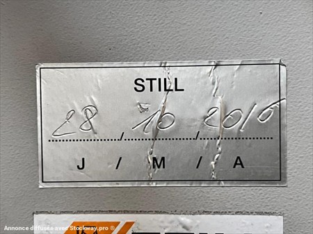 Chariot à mât rétractable électrique STILL FM-X17 N° de série 8096597004 Année 2016 - 2558 heures évolutives Cabine fermée Capacité 1,7T Hauteur de levée 6m Mat triplex Levée libre : 1,64m Longueur de fourche 115cm Dimensions : Largeur 1,27m x Haut 2,50m Poids 3320Kg Batterie à électrolyte 48V / 775Ah Batteries changée en 2023 Lors de sa réception, un employé qualifié de DB EQUIPMENT a effectué un contrôle des éléments essentiels du matériel, et a pu constater : son bon fonctionnement général. Ce matériel est disponible sur parc, et peut être essayé sur nos horaires d'ouverture sur simple rendez-vous. REPRISE ET LIVRAISON POSSIBLE Nous nous efforçons de publier des informations les plus précises possibles mais aucun droit ne peut être tiré des textes publiés.