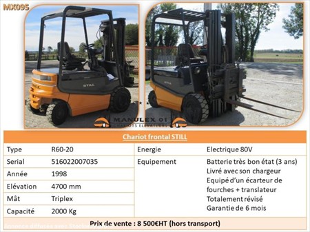 Chariot frontal STILL Chariot à énergie électrique de 1998 Capacité de charge : 2000 Kg Hauteur de levage : 4700 mm Batterie très bon état (3 ans) Chariot avec mât triplex Chariot équipé d'un translateur de fourches Chariot équipé d'un écarteur de fourches Vendu avec son chargeur Entièrement révisé Garantie : 6 mois