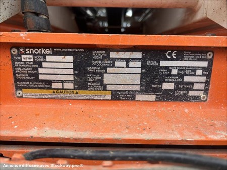 Hauteur de travail 7.79 m Longueur de plate-forme 1.62 m Largeur de plate-forme 0.72 m Longueur en transport 1.78 m Largeur en transport 0.81 m Hauteur en transport 2.11 m poids 1395 kg Charge utile 250 kg Vitesse de déplacement 3.2 km/h Rayon de braquage à l'extérieur 1.63 m BATTERIES NEUVES VGP OK TRANSPORT SUR DEMANDE