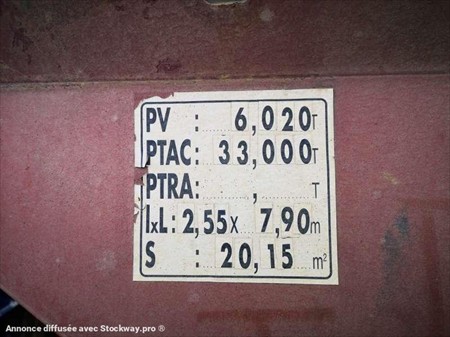 Cette semi benne de la marque robuste kaiser 2 essieux est de 2000.Longueur : 7 M 90Largeur : 2 M 55Poids : 6.020 KGPTAC : 33 T Charge utile : 26.980 Kg