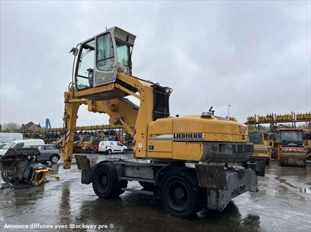 Cette pelle industrie de la marque Liebherr est le modèle A316 Litronic de 2001. Longueur : 8 M 75 Largeur : 2 M 52 Hauteur : 3 M 16 Poids : 17.000 kg. Taille pneus : 10.00 - 20 Flèche : 5 M 50 Balancier : 3 M 45 4 patins Cabine hydraulique Pince de trie Moteur Deutz BF4M1013EC développe 86 kW (117 ch) 14.714 Heures