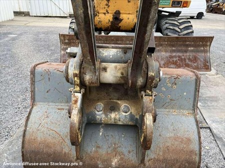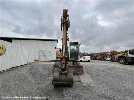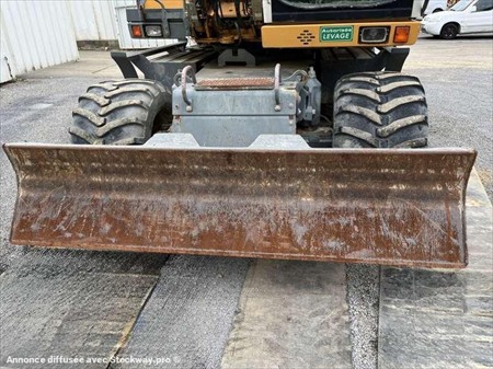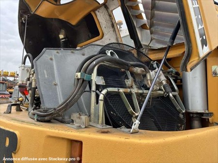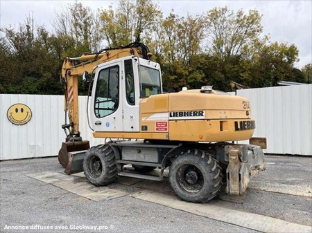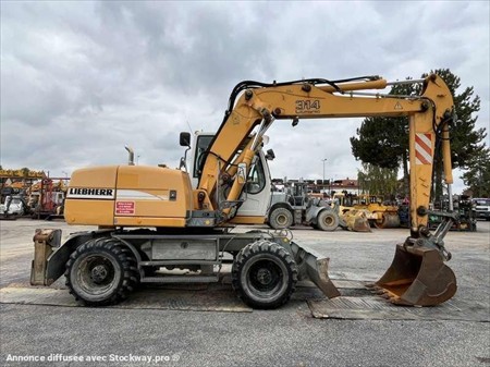 Cette pelle sur pneus de la marque Liebherr est le modèle A314 Litronic de 2005. Longueur : 8 M 15 Largeur : 2 M 55 Hauteur : 3 M 08 Poids : 14.480 kg. Taille pneus : 600/40-22.5 Flèche à volée variable Clapets de sécurité Lignes hydrauliques supplémentaires Attache Liebherr SW33 Deux patins Lame Moteur Deutz BF4M1013EC de 80 kW (110 ch) 10.021 Heures
