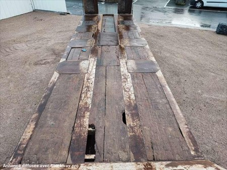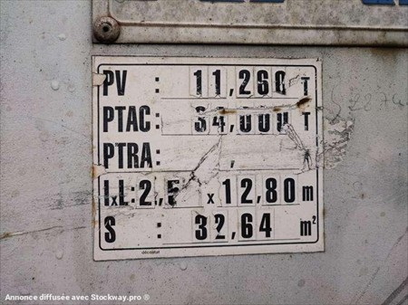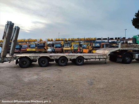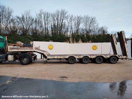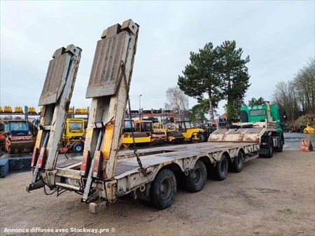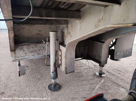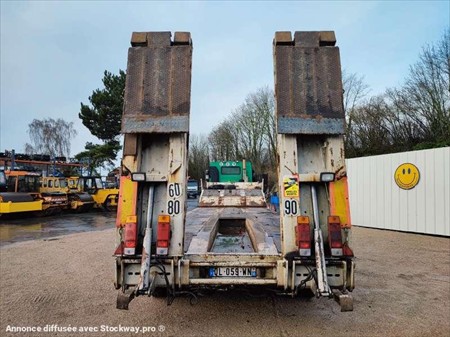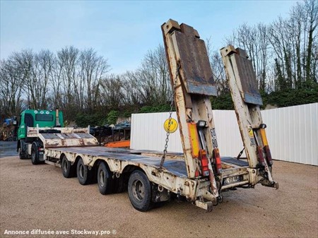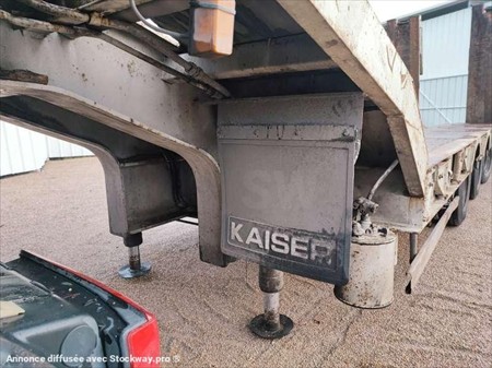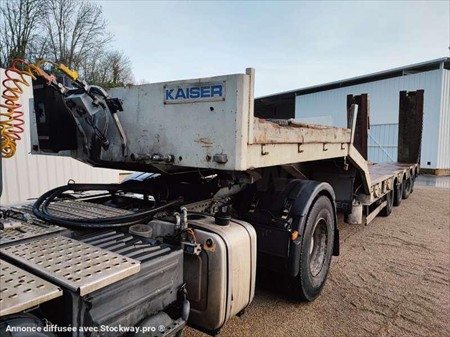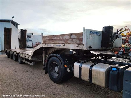 Ce porte engins de la marque ROBUSTE KAISER 4 essieux est de 1998. Longueur : 12 M 80 Largeur : 2 M 55 Poids : 11.260 kg PTAC : 34 T PTAC exceptionnel : 67 T Taille des pneus : 9.5 R 17.5 Charge utile : 22.740 kg Suspensions à air 2 essieux directionnels Rampe double Longueur plateau : 8 M 46 Longueur col de cygne : 3 M 51 Longueur rampes : 2 M 75