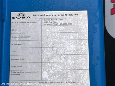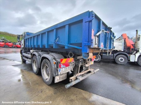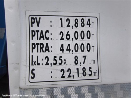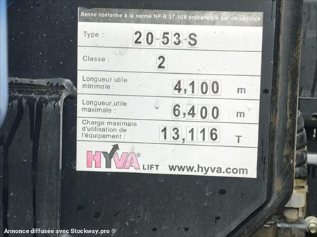 1ère mise en circulation : 08/08/2018 Energie : Gazole Marque : Renault Kilométrage : 385047 km au compteur Modèle : TGS 33.460 6X4 Pneus AV BRIDGESTONE 13R22.5 Pneus AR MICHELIN 13R22.5 Poids à vide : 12.884 Tonnes PTAC : 26.0 Tonnes PTRA : 44.0 Tonnes Bras : HYVA Type : 20.53.S Année : 2018 Boîte Automatique Echappement vertical Blocage Différentiel Crochet MG Siège pneumatique Certificat de carrossage présent Carnet d’entretien Benne en Bleu 2025 6m L, 2.40m l, 75cm H en supplément 5000E Matériel en très bon état !
