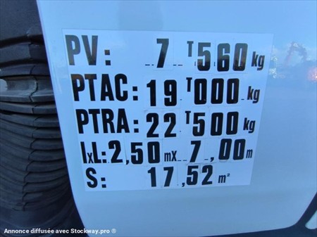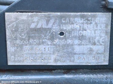 1ère mise en circulation : 16/04/1999 Energie : Gazole Marque : Renault Kilométrage : 784 375 km au compteur Modèle : 260.19 Camion Ampliroll Pneus AV FIRESTONE 315/80R22.5 Pneus AR HANKOOK 315/80R22.5 Poids à vide : 7.560 Tonnes PTAC : 19.00Tonnes PTRA : 22.50 Tonnes Boîte manuelle 8 vitesses 2x4 Casquette Bras articulé 14 Tonnes Marque : GUIMA Modèle : BL 14 Empattement 4.87 M Echappement vertical Blocage Différentiel Siège pneumatique Boite Ok, Moteur Ok, Pont Ok Benne en supplément 3000e HT Mécanique très propre pour un camion de 784 000km !