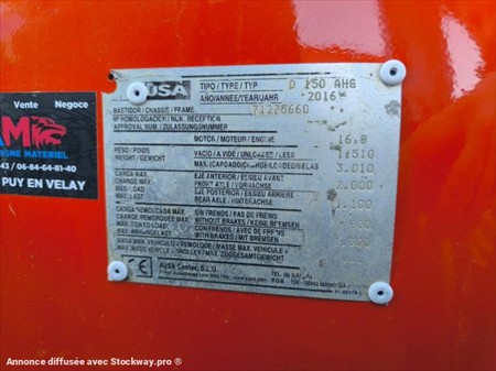 Année : 2016 Marque : Ausa Modèle : D150AHG Horamètre : 938 Heures compteur Capacité : 1.5 Tonnes Poids à vide : 1.510Tonnes PTAC : 3.1 Tonnes Moteur Kubota 18.0 Kw D1105 Pneus AV 255/75-15.3 Pneus AR 255/75-15.3 Tête rotative Benne basculante 0.65m3 4 RM Très bon état !