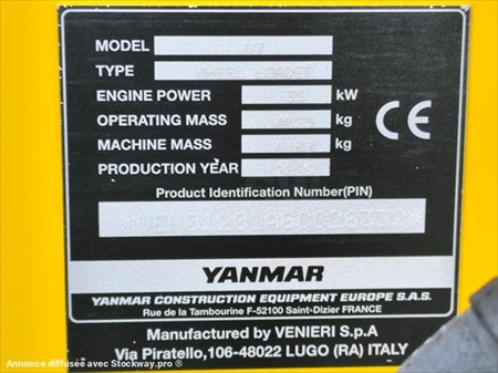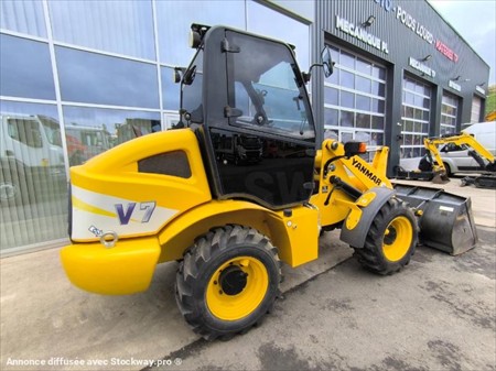 Marque : Yanmar Modèle : V7 Wheel Loader Année : 2016 Nombre d’heures : 389 h compteur Puissance : 35 KW Moteur : Yanmar Hauteur max. de déversement : 2.46 m Largeur du godet : 1.70 m Poids : 4.1 t Longueur : 4.8 m Largeur de transport : 1.70 m Hauteur de transport : 2.46 m Vitesse de déplacement : 20 km/h Attache rapide hydraulique Transmission hydrostatique Pneu MITAS 12.0/75-18 Godet : 700 L Matériel en bon état !