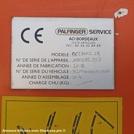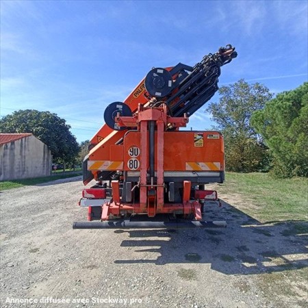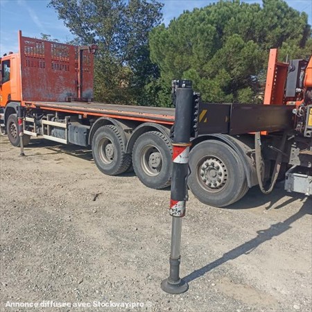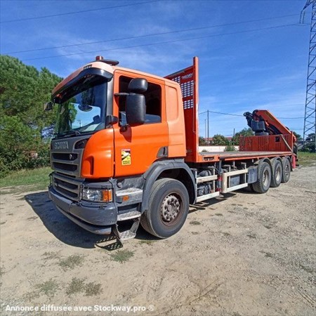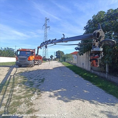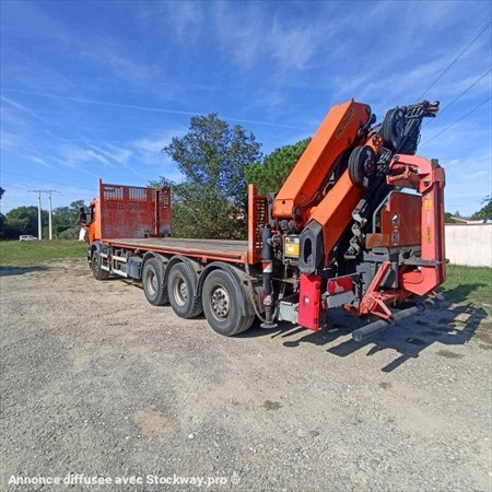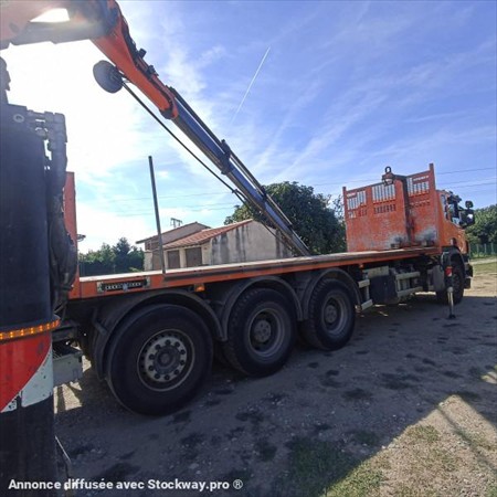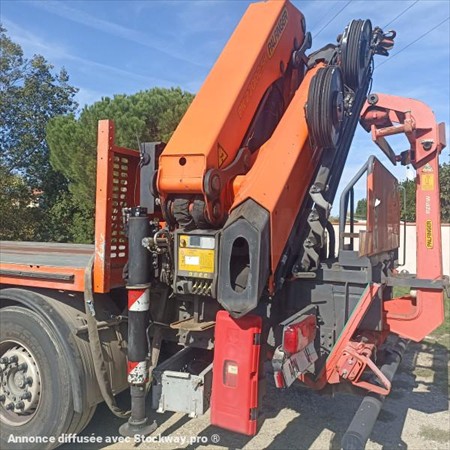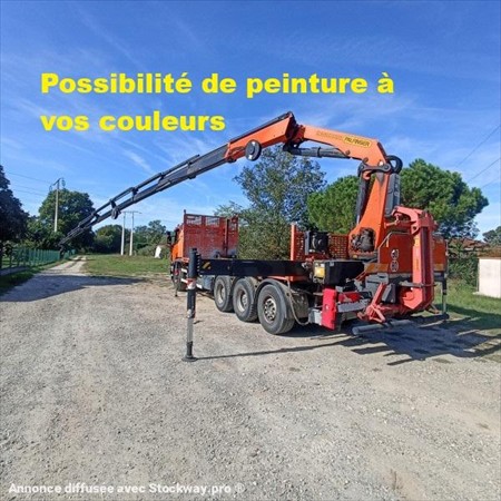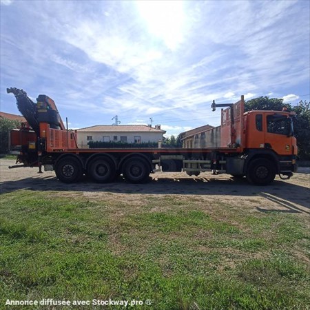 PLATEAU/GRUE SCANIA P410 8x4x4 Année : 30/03/2016 242 600 KMS, Kilométrage d'origine affiché au compteur Poids à vide : 19T276 PTAC : 32T lxL : 2.55m x 11.26m Boite Automatique GRUE de marque PLAFINGER Modèle : PK 27002-SH G 9 extensions Radiocommande sans fil ROTATOR 3 006 heures Capacitée de levage maximum : 7 300 kg Longueur maximum : 23.1m Levée en bout de flèche : 560 kg Possibilité de peinture à vos couleurs Contrôle technique valide Pour plus de renseignements merci de nous contacter au 06.17.29.20.50 Cordialement GOVIN Stéphane