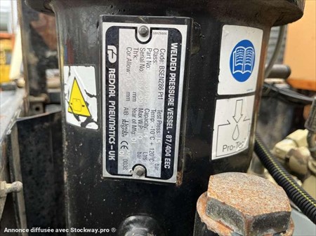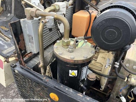 Ce compresseur de la marque INGERSOLL RAND est le modèle R1090 de 2001. Longueur : 2 M 80 Largeur : 1 M 45 Hauteur : 1 M 30 Poids : 760 kg Pression de service maximale autorisée : 8,6 Bar Pression de service normale : 7 Bar Débit d'air (m3/min) : 3.10 Moteur INGERSOLL de 25.3 kW (34 ch). 2357 heures
