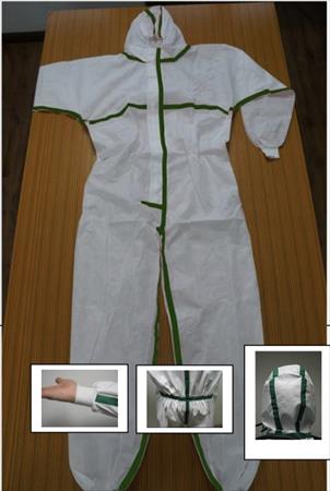 Combinaison blanche à capuche élastiquée “ pans, manches longues avec poinets élastiques, fermeture éclair avec rabat adhésif, coutures recouvertes de bandes thermocollées rouge, chevilles et taille élastiquées, rabat adhésif en partie haute de la fermeture éclair.