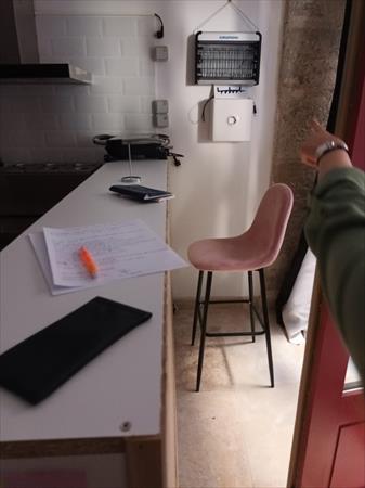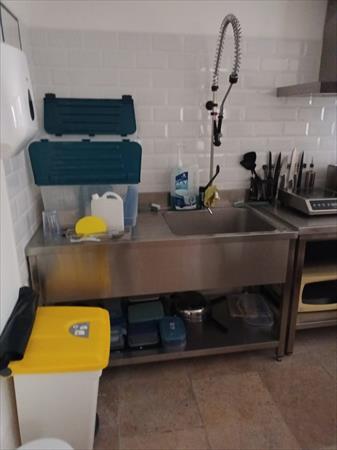 - une hotte ;- une table et une plonge en inox avec une douchette manuelle ;