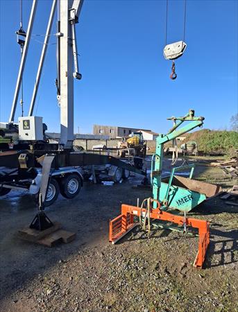Vendue avec lève palette, benne autovide, pince à dédoubler et benne à béton.La grue de 3,5 T est tractable par un camion de 3,5 T. Elle peut lever 1,5 T à 6 mètres jusqu'à 500 Kg à 16 mètres. Sa mise en place ce fait en 40 min sur un emplacement de 4,5 m de large.