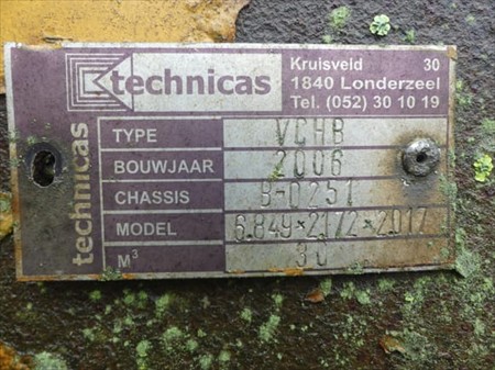 Container ouvert 30m³ Marque : Technicas Année : 2006 Longueur : 685 cm Largeur : 217 cm Hauteur : 200 cm Numéro interne vendeur (Ref) : 05 État : à reconditionner Equipé Avec filets rigides