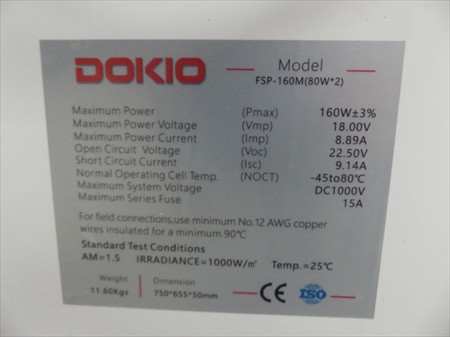 Panneaux solaire pliable Marque : Dokio Modèle : FSP-160M Longueur : 75 cm Largeur : 65 cm Hauteur : 5 cm Poids : 11,6 kg Quantité : +/-3 État : Fonctionnel