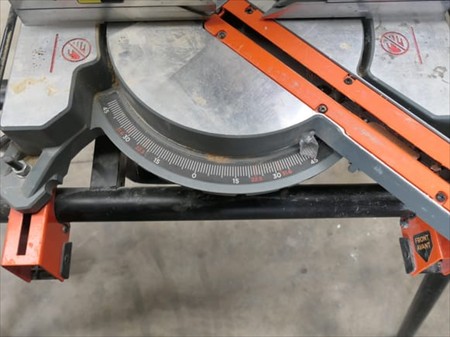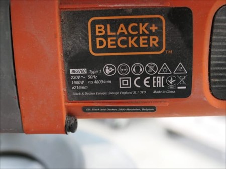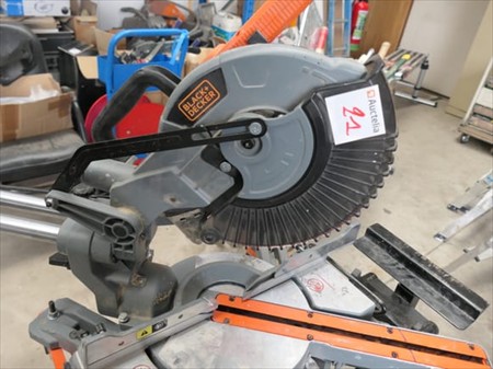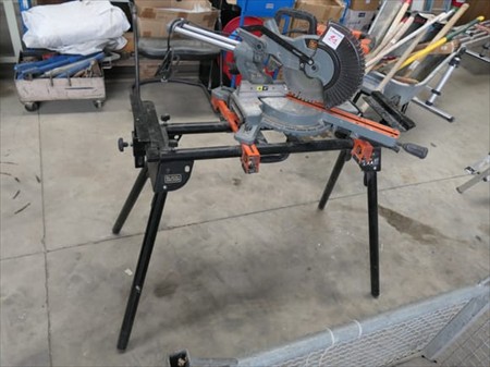 Scie à onglet et son pied repliable Marque : Black & Decker Modèle : BES700 Tension : 230V Mono Puissance : 1600 Watts Quantité : 1 Testé : Non Diamètre de lame : 216 mm État : bon État visuel Remarques : Visite conseillée