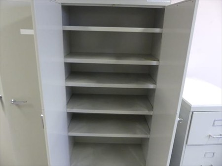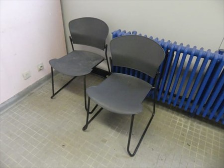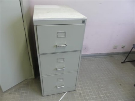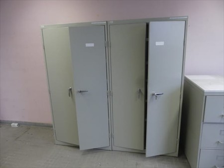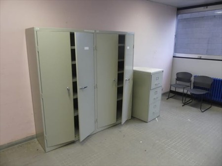 Mobilier de bureau Composition : +- 2 x armoire double porte Dimensions : 91 cm x 45 cm x 180 cm 1 x armoire à dossiers Dimensions : 48 cm x 72 cm x 106 cm +- 2 chaises