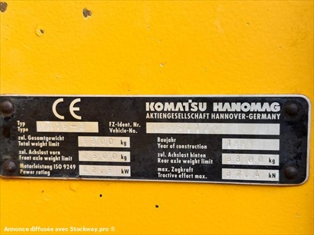 Chargeuse à pneus 5T Komatsu WA75-3 N° de série HA950125 Année 1998 - 5900heures évolutives Poids 5300Kg Équipé de son Godet drop en bon état Dimensions : L 5,4m x l 1,95m x H 2,65m Hauteur de déchargement 2,55m Vitesse d'avancement 20km/h Pneus 405/70R18 très bon état Moteur Komatsu 4D98E 3318cm³ Puissance 42,5kW / 60cv Lors de sa réception, un employé qualifié de DB EQUIPMENT a effectué un contrôle des éléments essentiels du matériel, et a pu constater : son bon fonctionnement général, bon démarrage à froid, toutes les fonctions hydrauliques sont OK, pas de fuites apparentes. Ce matériel est disponible sur parc, et peut être essayé sur nos horaires d'ouverture sur simple rendez-vous. REPRISE ET LIVRAISON POSSIBLE Nous nous efforçons de publier des informations les plus précises possibles mais aucun droit ne peut être tiré des textes publiés.