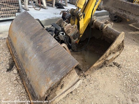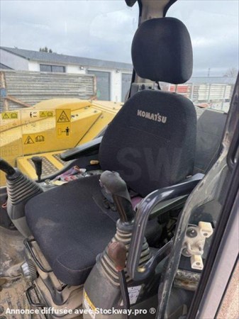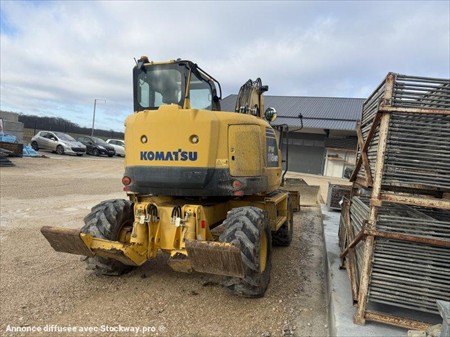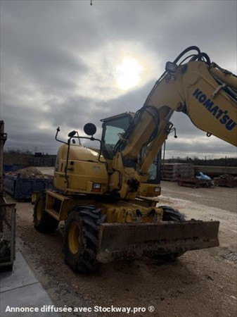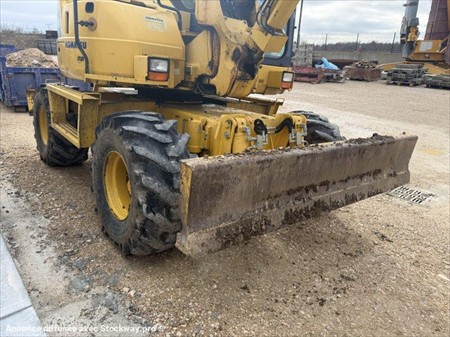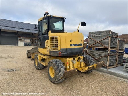 Pelle à pneus KOMATSU PW118MR-8 Année : 2012 Heures : 6700 Poids : 13.5 tonnes Lame + stabilisateurs Déport pied de flèche – Flèche à volée variable Lignes hydrauliques Attache + 3 godets (tranchée, terrassement et curage inclinable)