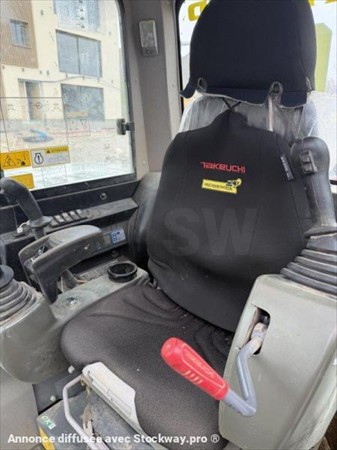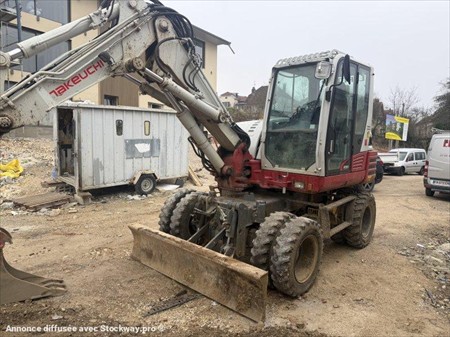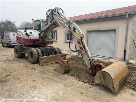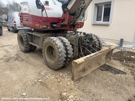 Pelle à pneus TAKEUCHI type TB295W Année : 2022 Heures : 2500 environ Poids : 10 t – Largeur : 2.33 m Lignes hydrauliques - Pneus jumelés – Lame – Stabilisateurs Déport pied de flèche – Volée variable Attache rapide hydraulique POWERTILT + 4 godets