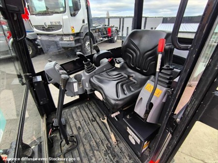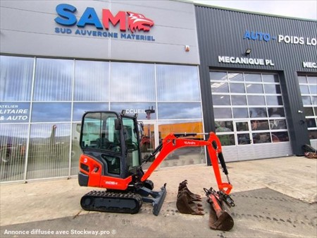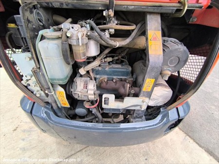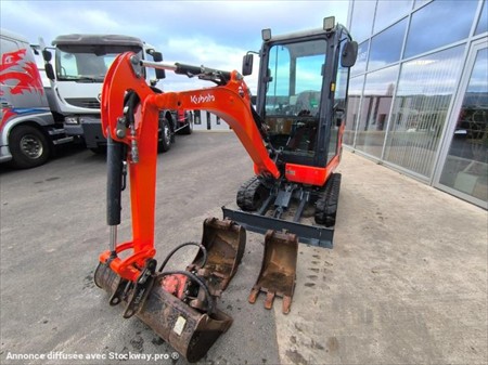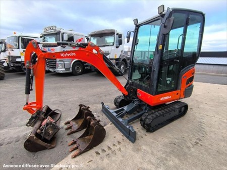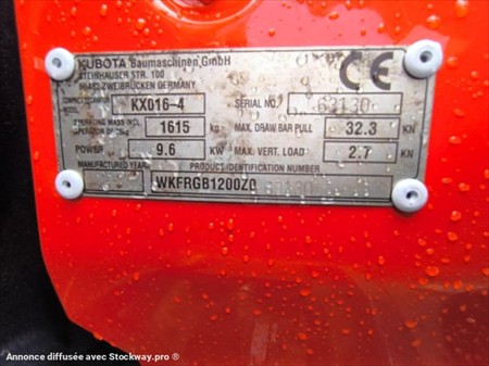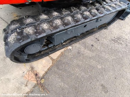 Année : 2018 Marque : KUBOTA Modèle : KX016-4 Lame bull 124 cm rabattable en fonction de l’écart entre les chenilles Voie variable Canopy Moteur 3 cylindres KUBOTA Puissance : 9.6 KW Poids à vide : 1.6 Tonnes Nombre d’heures : 587 H au compteur Nombre de godets : 3 98 cm , 36 cm et 27 cm Patin Kubota 230 M/M Attache rapide mécanique Déport pied de flèche Chenilles en très bon état Possibilité BRH en supplément 1500€ Matériel en très bon état !
