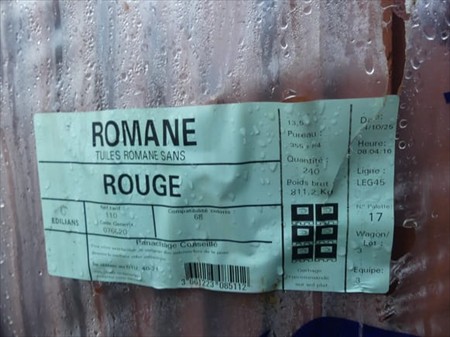 Tuiles Marque : Edilians Modèle : Romane rouge Largeur : 22 cm Hauteur : 38 cm Poids : 811 kg Quantité : +- 230 Quantité approximative Lot réparti sur 1 palette