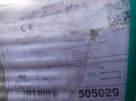 Briques Marque : Wienerberger Modèle : Patrimonia Oud Rieme Longueur : 21,5 cm Largeur : 10 cm Hauteur : 6,5 cm Poids : 1480 kg Quantité : +- 660 Quantité approximative Lot réparti sur 1 palette