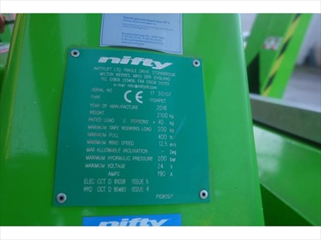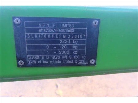 NACELLE ELEVATRICE NIFTYLIFT limited Marque: NIFTYLIFT 1ère immatriculation : 20/01/2016 Numéro de châssis : SLN170HPEFM033107(01) Carburant : Essence Certificat d'immatriculation (2 volets) Certificat de conformité Remarques : A démarré lors de l'inventaire N° de série 17 33107 Bi-énergie Batteries environ 6 mois Freins révisés