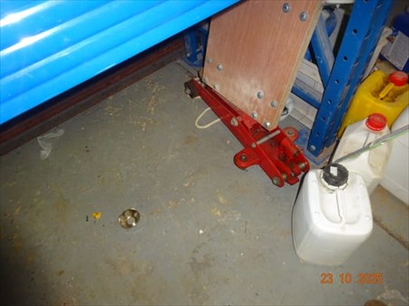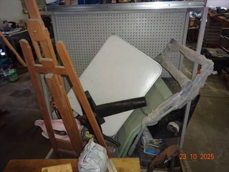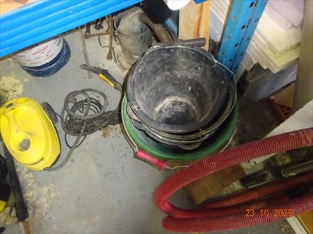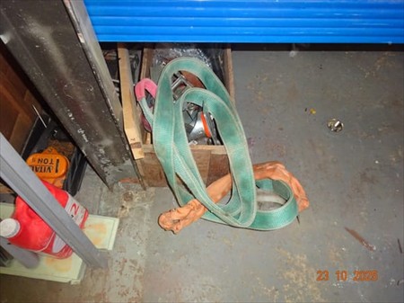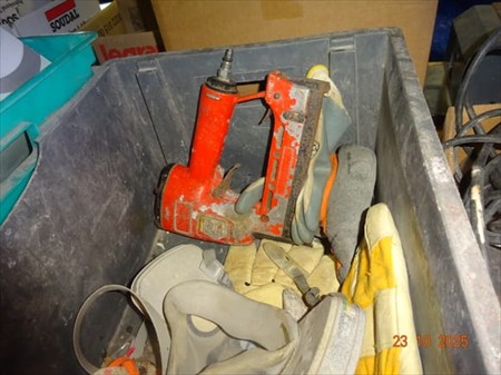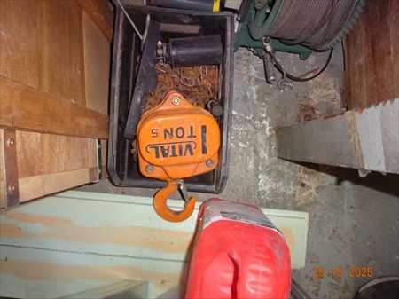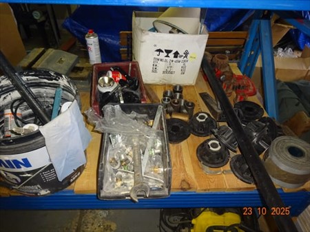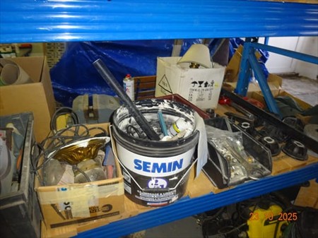 1 palan, casque à souder, mèches, phare clignotant, phare, divers bidons, gaine électrique, cloueuse air comprimé, nettoyeur à eau KARCHER, échelle, trépied, étau, serre-joint, brosse, pelle à derbigom