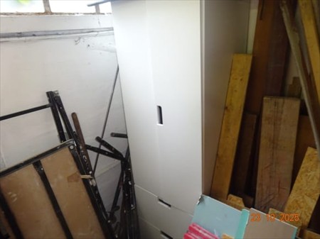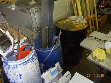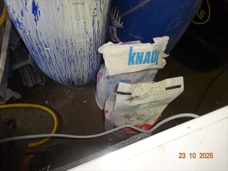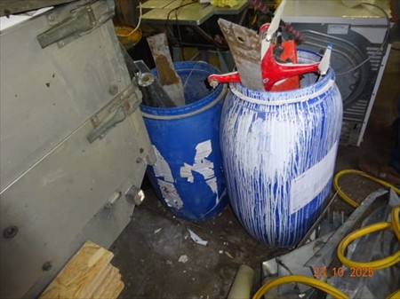 Le contenu de la pièce à sanitaire dont tréteau, bidons divers