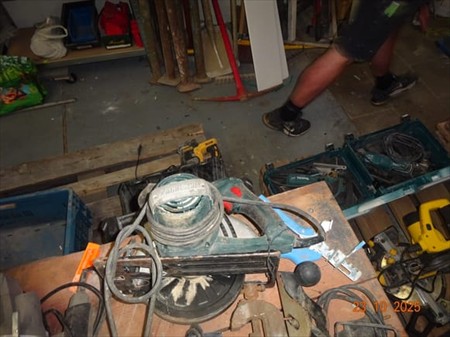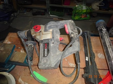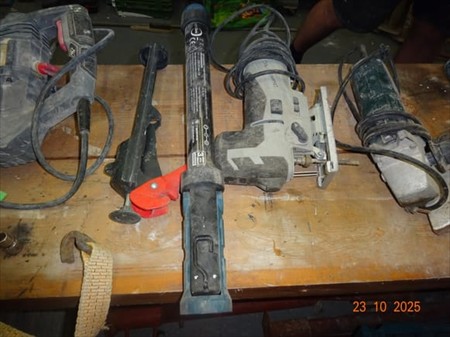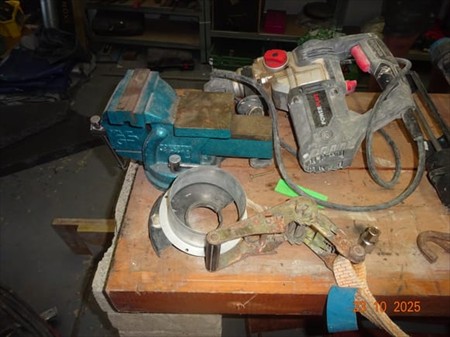Le contenu de l'établi (support sur bloc + 2 poutrelles) dont : 1 étau, 1 marteau pic POWER PLUS, 1 pompe à silicone, 1 lampe1 scie sauteuse BUROPRO, 1 disqueuse BETABO, 1 foreuse BOSCH GSB/2RE, 1 défonceuse ROCKWELL, 1 phare, 1 agrafeuseélectrique, 1 scie circulaire MAGNERIUM