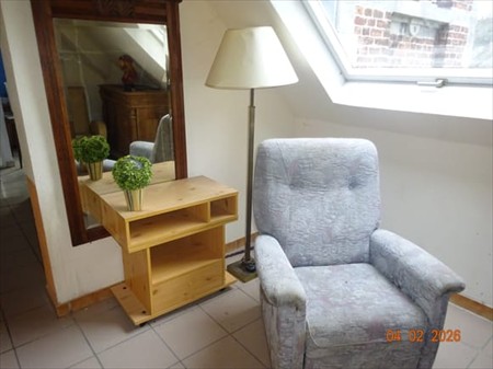L' Ensemble de la petite pièce faisant office de rotonde : 1 meuble en chêne deux portes deux tiroirs 1 chaise 1 Christ en plâtre 1 cadre représentant un chien 1 fauteuil relax en skaï 1 fauteuil en tissu gris 1 lampe sur pied 1 miroir 1 petit meuble en stratifié sur roulettes L' Ensemble de la pièce doit être vidé