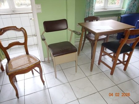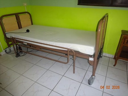 1 lit électrique sur roulettes Avec matelas 90/200 tête et pied réglables 1 garde-robe deux portes 1 table 2 chaises 1 chaise percée 2 fauteuils en skaï bleus 1 lit électrique sur roulettes 90/200 tête et pied réglable 1 chaise en bois 2 tables de nuit L' Ensemble de la pièce doit être vidé