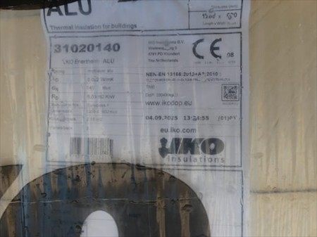 Panneaux isolants Epaisseur 14 cm Marque : Iko Longueur : 120 cm Largeur : 60 cm Hauteur : 14 cm Quantité : +- 24 Avec couche aluminium Lot réparti sur une palette