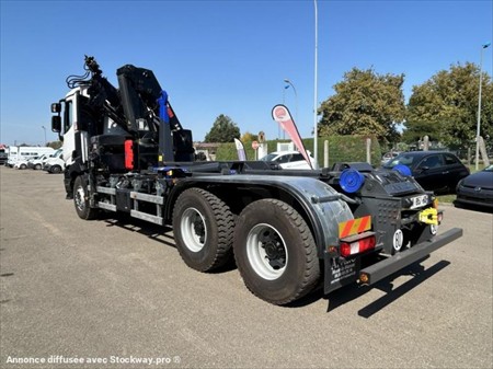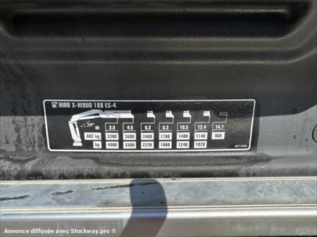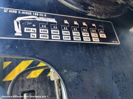 Véhicule équipé, boite auto, clim, blocage pont et inter-ponts, bras neuf JI14000, Grue HIAB 188 ES4 HIDUO 4 extensions lèvent 1T050 à 12M40 5eme et 6eme fonction à radiocommande. Véhicule entièrement révisé et garantie 3 mois sur la chaine cinématique.