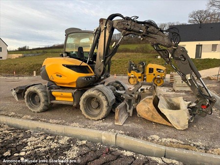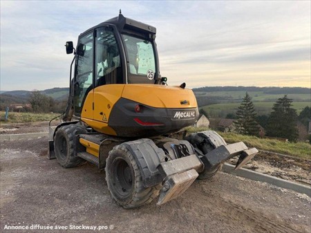 Pelle sur pneus MECALAC type 9MWR Année : 2020 Heures : 5200 Poids : 9 t Longueur transport : 4.42 m - Largeur transport : 2.31 m - Hauteur transport : 2.83 m Vitesse de déplacement : 20 km/h Moteur Deutz TCD2.9 L4 (55.4 kW) Lame – Stabilisateurs – Déport – Volée variable – Lignes hydrauliques Coupleur hydraulique + 2 godets (terrassement et curage inclinable)