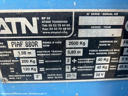 VGP OK TRANSPORT SUR DEMANDE livraison offerte dept 31 et limitrophes Hauteur de travail 8,8 m Charge nette 200 kg Longueur de la plateforme 0,8 m Largeur de la plateforme 0,93 m longueur de transport 2,83 m largeur de transport 1,04 m Poids 2600 kg Personnes 2