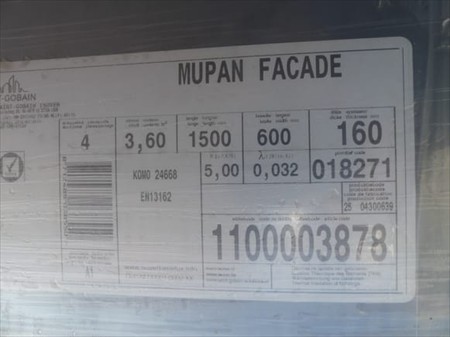 Panneaux isolants laine de verre Epaisseur 16 cm Marque : Isover Modèle : Mupan Facade Longueur : 150 cm Largeur : 60 cm Hauteur : 16 cm Quantité : +- 96 Panneaux isolants pour façade Lot réparti sur 2 palettes