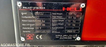 MARQUE : HELI MODELE : CDD12J ANNEE : 2022 NOMBRE D'HEURE : 0 Mât duplex Capacité : 1.2T Hauteur de mat : 3500 mm Fourches : 1150 mm Batterie LITHIUM 24V-60Ah Chargeur 24V -30Ah intégré