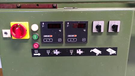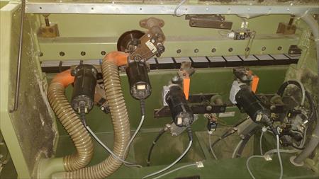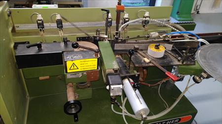 Plaqueuse de chants Holz-her . 1992 . Excellent état. Longueur de 3,30 m .avec 1 carton complet de pains de colle . Patins de chaîne de transport neufs . Fraise droites et fraises à 30° . 380 volts .